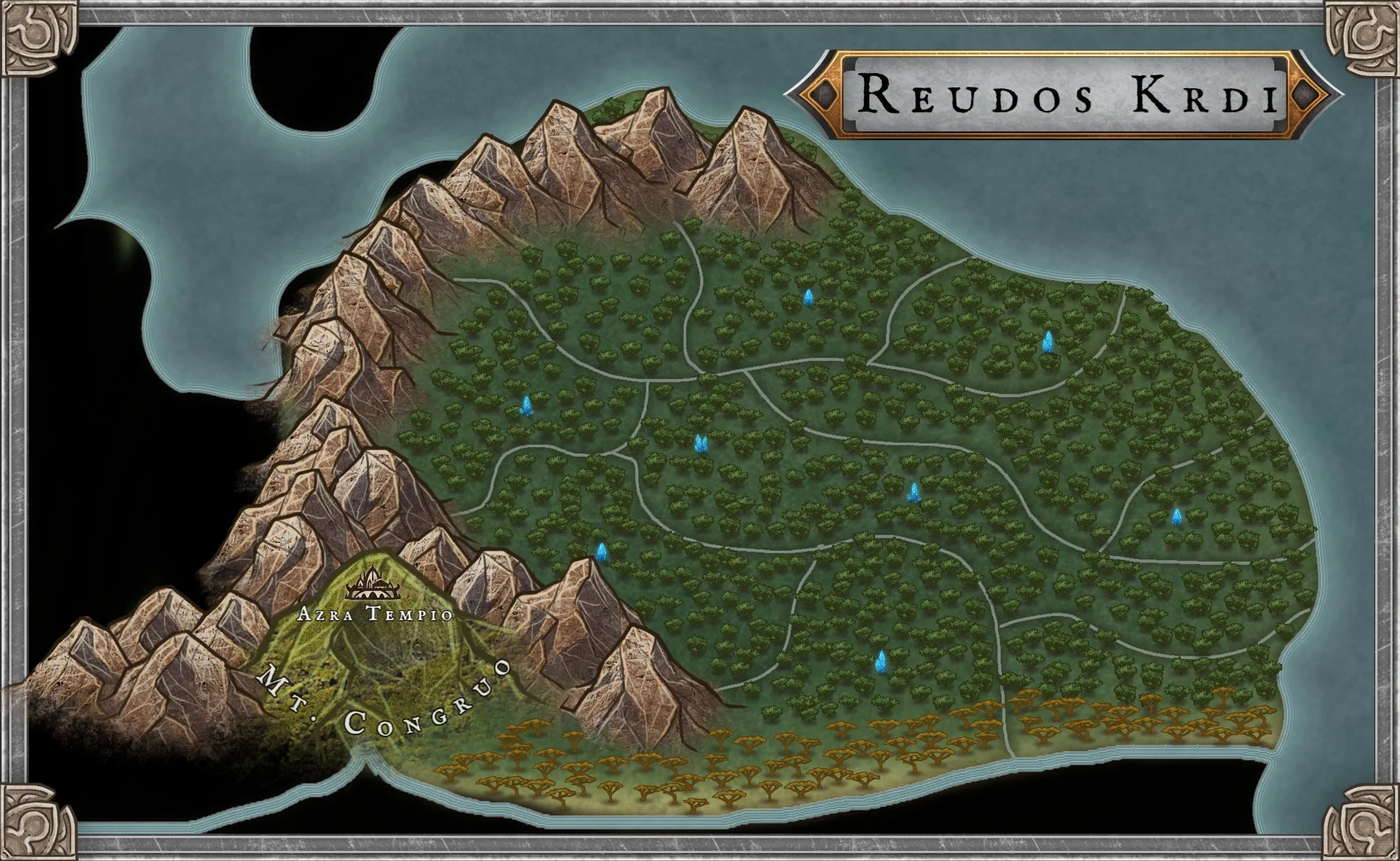 Home of the Azra Druids, and chosen council ground for the Wildheart Concord, the Reudos Krdi, the Heart of the Wilderness in common tongue, is a luscious and barely desturbed area of raw druidic power. The many rivers that run through the area, known as veins, are home to many plants and animals vital to many alchemical brews and salves. Towering blue crystals scatter the dense woodland, growing at a much faster rate than any non-magical crystal would. These crystals are used as druidic focuses by the Azra Druids and have inherrent healing properties. This makes them really sought after but the Druidic people refuse to share the harvests of the Reudos Krdi, making them big in underground markets and incredibly valuable outside of the Druidic Circles. The symbiotic relationship between the Druids and Sesmi allows this region to flourish almost unnaturally to the envy of many in the wider world.