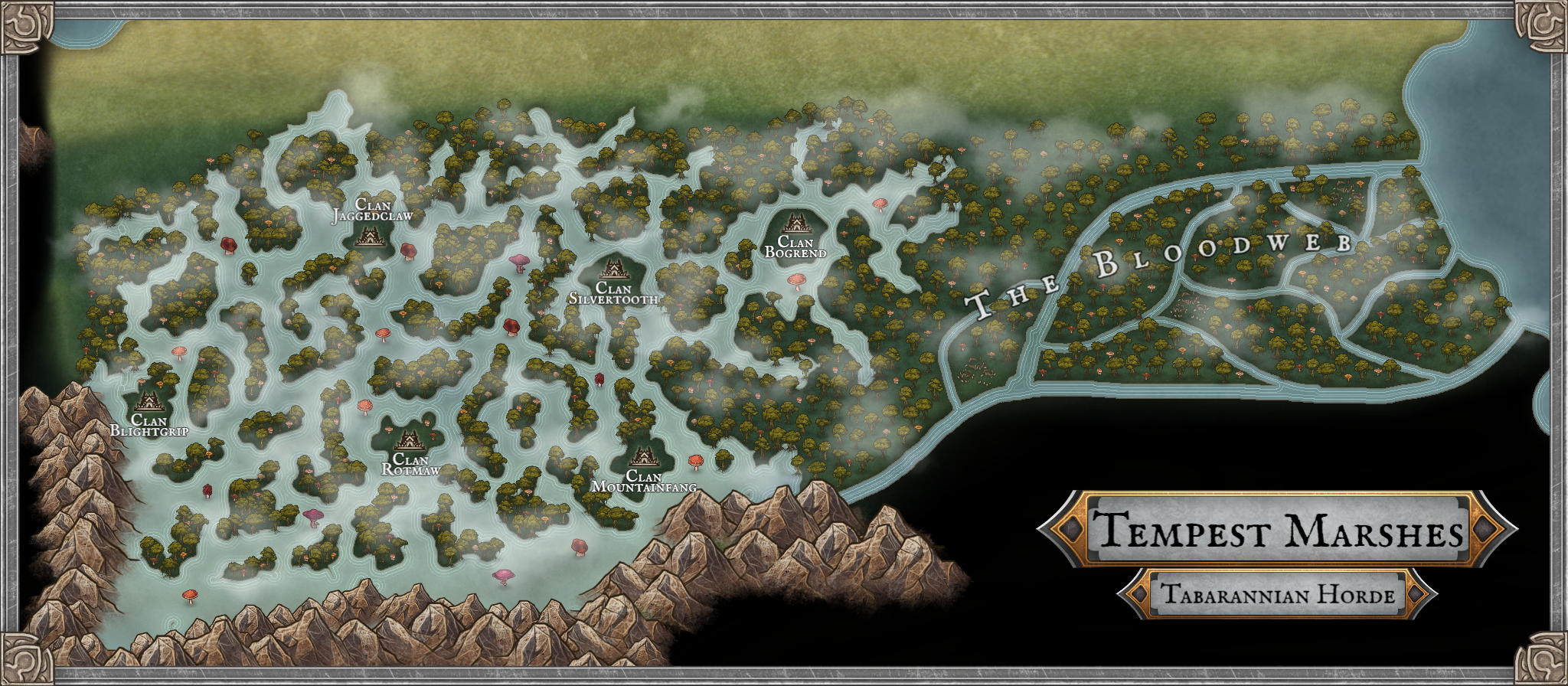 To the east, the Tempest Marshes transition into a deltaic expanse known as the Bloodweb, where distributary channels spread toward the open coast. The region’s name derives from the distinct red coloration of its waters and sediment. While the hue originates partly from chemical deposits and decomposing organic matter, the intensity and persistence of the coloration are linked to a supernatural contaminant, a residual corruption believed to stem from a darker source. This influence alters the mineral composition of the soil and water, producing ocassional mild necrosis on local vegetation and fauna with extended exposure.